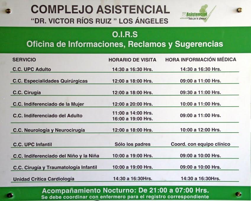 Señor usuario, debido a la contingencia sanitaria que atraviesa nuestro país, la visita de usuarios hospitalizados esta suspendida con el objetivo de minimizar las posibilidades de contagio, con el fin de cuidar a nuestros pacientes y funcionarios. Los horarios aquí expuestos corresponden a tiempos normales de atención a público. |